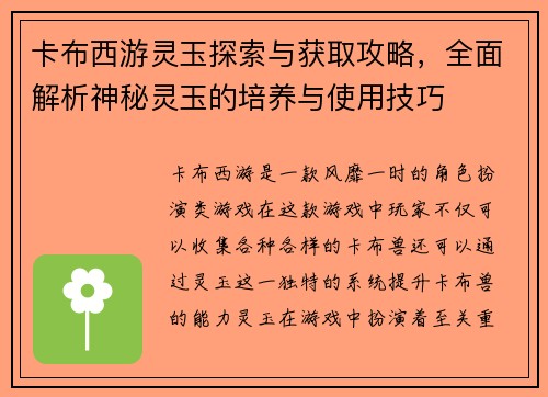 卡布西游灵玉探索与获取攻略,全面解析神秘灵玉的培养与使用技巧